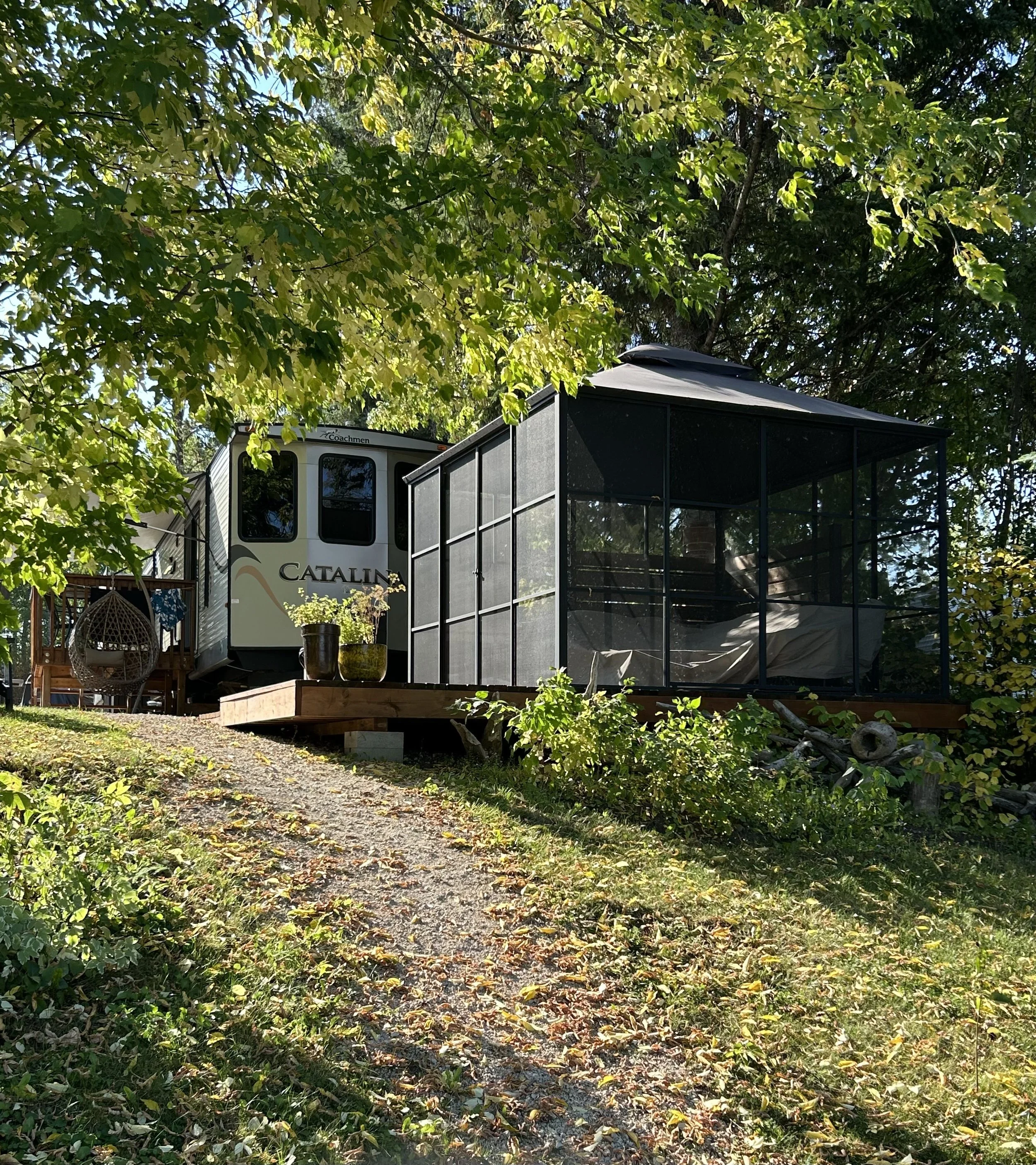 The trailer is fully furnished, comes with your very own dock, a gazebo, and a 6x8 storage shed with shelving unit. Turn key ready for an enjoyable camping experience.